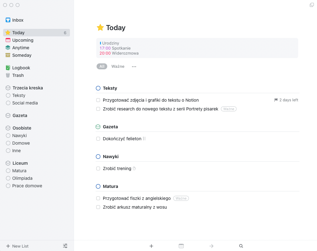 W 2018 roku odkryłam, czym jest bullet journaling i się w nim zakochałam. Krótko mówiąc, jest to metoda organizacji, która polega na tworzeniu spersonalizowanych harmonogramów, list zadań i kalendarza w jednym notatniku. Brzmi fajnie, ale ci, którzy zajmują się bullet journalingiem, wiedzą, że łatwo przesadzić z planowaniem i ozdabianiem stron. W pewnym momencie wypisywanie wydarzeń i zadań w pięknych, własnoręcznie wykonanych szablonach zajmuje więcej czasu niż ich realizacja. Nadal, kiedy mam do zrobienia jakiś projekt, lubię najpierw stworzyć jego plan w moim zeszycie. Kiedy piszę nowy tekst, zaczynam od mapy myśli na prawdziwej kartce, bo mam wtedy wrażenie większej wolności, pobudza to moją kreatywność. Od czasu do czasu lubię zaplanować nadchodzący tydzień na kartce (szczególnie, gdy wiem, że czeka mnie dużo rzeczy i potrzebuję wizualnie to sobie ogarnąć). Ale gdy zależy mi na szybkim tworzeniu listy zadań na co dzień – tak, żebym mogła te zadania dodawać, usuwać, modyfikować, zmieniać terminy, nie tworząc przy okazji nieestetycznego chaosu – wybieram aplikację Things. Podobnie jest z kalendarzem (ja korzystam z systemowej aplikacji kalendarza na iOS i MacOS). Dodatkowo muszę mieć do tych rzeczy dostęp zawsze i wszędzie, a zeszyt tego nie umożliwia (w przeciwieństwie do telefonu).