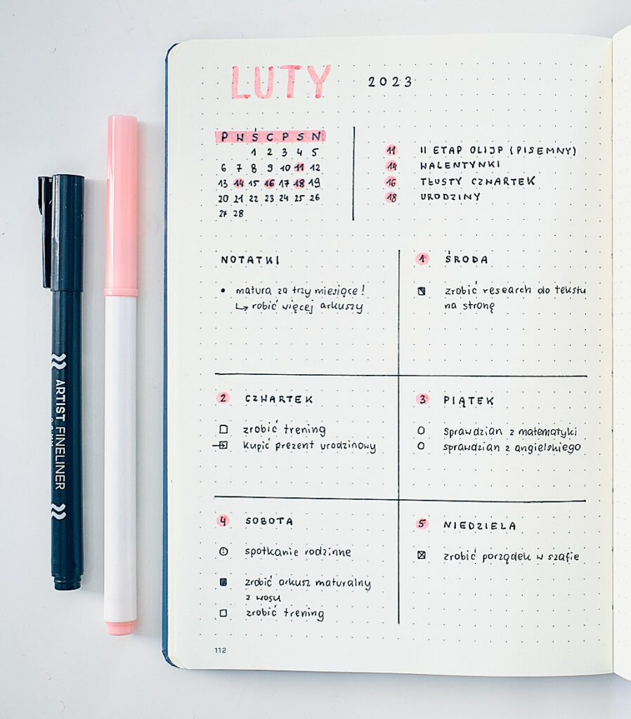 Przykładowy sposób rozplanowania tygodnia w bujo