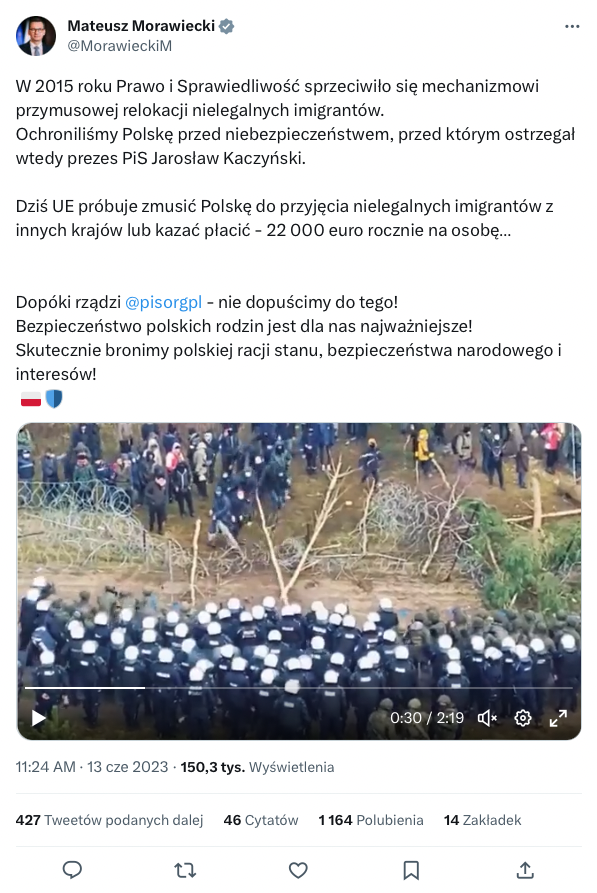 Polską retorykę antyuchodźczą i tworzenie wizerunku uchodźcy-obcego/innego znamy już z 2015 roku, kiedy to została wykorzystana w kampanii wyborczej – widać teraz też zdecydowano się po nią sięgnąć. Znowu możemy czytać o „obronie świętych granic”, o tym, że bezpieczeństwo polskich rodzin jest najważniejsze i tak dalej… Niech tweet premiera będzie przykładem takiej narracji.