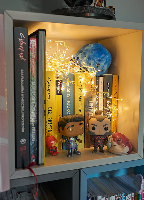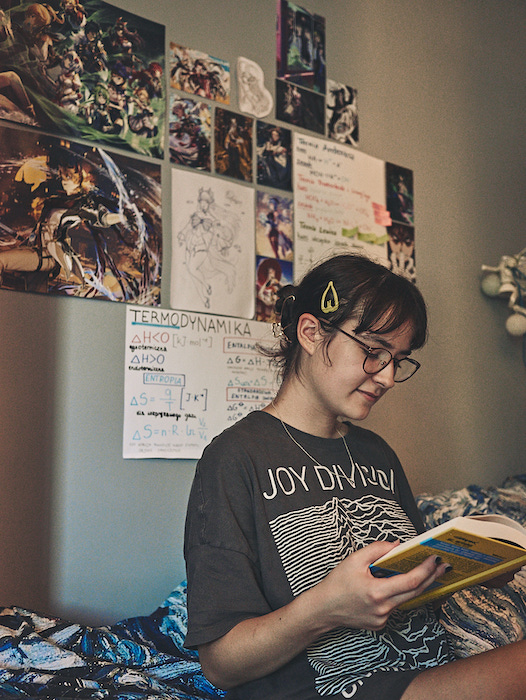 Dzisiaj mam okazję odwiedzić Zuzię w jej pokoju – swoją drogą, odzwierciedlającym w dużym stopniu to, czym się zajmuje. Ściany całe w plakatach z postaciami z gier RPG, wzorach chemicznych chromu i platynowców, a koło komody własnoręcznie wykonany dwumetrowy miecz do stroju na konwent, na półce Śmiech w ciemności Nabokova i Cyberpunk 2077: Bez przypadku.