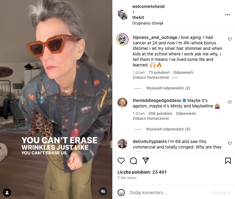 tłum. „Nie możecie wymazać zmarszczek, tak samo jak nie możecie wymazać nas.” [zwrot do Maybelline, producenta reklamy antyzmarszczkowego kosmetyku] | Heidi Clements | Instagram